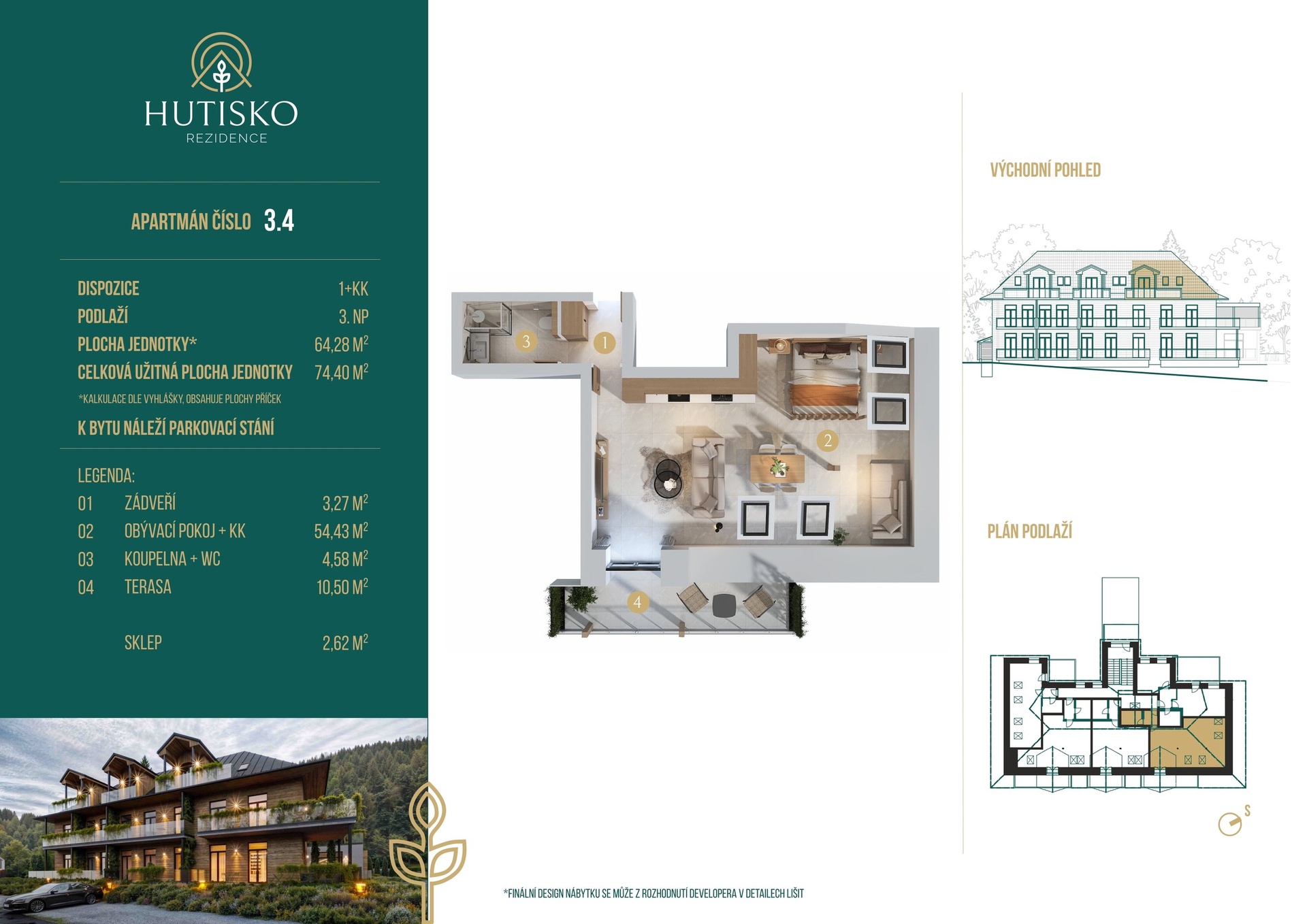 V nejvyšším, 3. nadzemním podlaží Rezidence Hutisko, se nachází tento prostorný a dokonale prosvětlený byt 1+kk (64 m2), který vás okouzlí svou atmosférou i promyšleným uspořádáním. Velkorysý otevřený interiér je přirozeně rozdělen na obytnou část a klidovou zónu pro ložnici, takže prostor působí vzdušně, ale zároveň útulně. Smart Home Living by Loxone Každý byt v Rezidenci Hutisko je vybaven chytrým systémem Loxone Smart Home Living. Ten umožňuje automatizaci světel, topení, žaluzií i řízení vstupu. Díky němu si můžete přizpůsobit své bydlení přesně podle svého rytmu a potřeb, včetně možnosti pohodlného ovládání hudby. Rezidence je navržena s ohledem na moderní technologie i udržitelný provoz. Komfort, který přesahuje běžné bydlení Každý byt v Rezidenci Hutisko je plně vybavený do posledního detailu - od nábytku a kuchyňského zařízení až po textilie a dekorace. Celý interiér tvoří harmonický celek s důrazem na přírodní materiály a valašský charakter projektu. Střešní okna zaplavují interiér denním světlem a umožní vám pozorovat oblohu přímo z postele. Večerní světlo se mění v jemné teplo, které se odráží od dřevěných povrchů a vytváří klidnou, domáckou atmosféru. Dominantou bytu je prostorná terasa (10,5 m2), na kterou vstoupíte přímo z obývací části - ideální místo pro ranní kávu nebo večerní sklenku vína s výhledem na beskydské hřebeny. Služby a zázemí Projekt nabízí jedinečné horské bydlení se zajištěnou správou. Byty budou zkolaudovány k trvalému bydlení, čímž vzniká výjimečná příležitost vlastnit nemovitost v horách, která splňuje veškeré standardy pro celoroční užívání i trvalé bydliště. Parkovací místo a sklep jsou zahrnuty v ceně. Rezidence Hutisko Projekt Rezidence Hutisko představuje moderní způsob pojetí horské bydlení v souladu s budoucím přímo sousedícím wellness v nově budovaných Máchových lázních, vše v srdci Beskyd, v obci Hutisko-Solanec. Spojuje valašskou tradici s moderním komfortem, nadstandardním vybavením a službami zaručujícími plnou správu bez jakýchkoli starostí na Vaší straně. Díky své poloze nabízí naprostý klid, čistý vzduch a přímý kontakt s přírodou, ale i pohodlnou dostupnost městských služeb v Rožnově pod Radhoštěm. Klíčové údaje • Dispozice: 1+kk • Podlaží: 3. (poslední) • Terasa: ano, přístupná z obývací části • Výbava: kompletní interiér, nábytek, kuchyň, textilie, dekorace • Služby: správce, údržba rezidence • Parkovací místo a sklep: zahrnuty v ceně Nabídka se týká jedné z 4 posledních jednotek volných v projektu. Kolaudace 2027. Pro další informace kontaktuje makléřku. Budeme se těšit na Váš zájem.