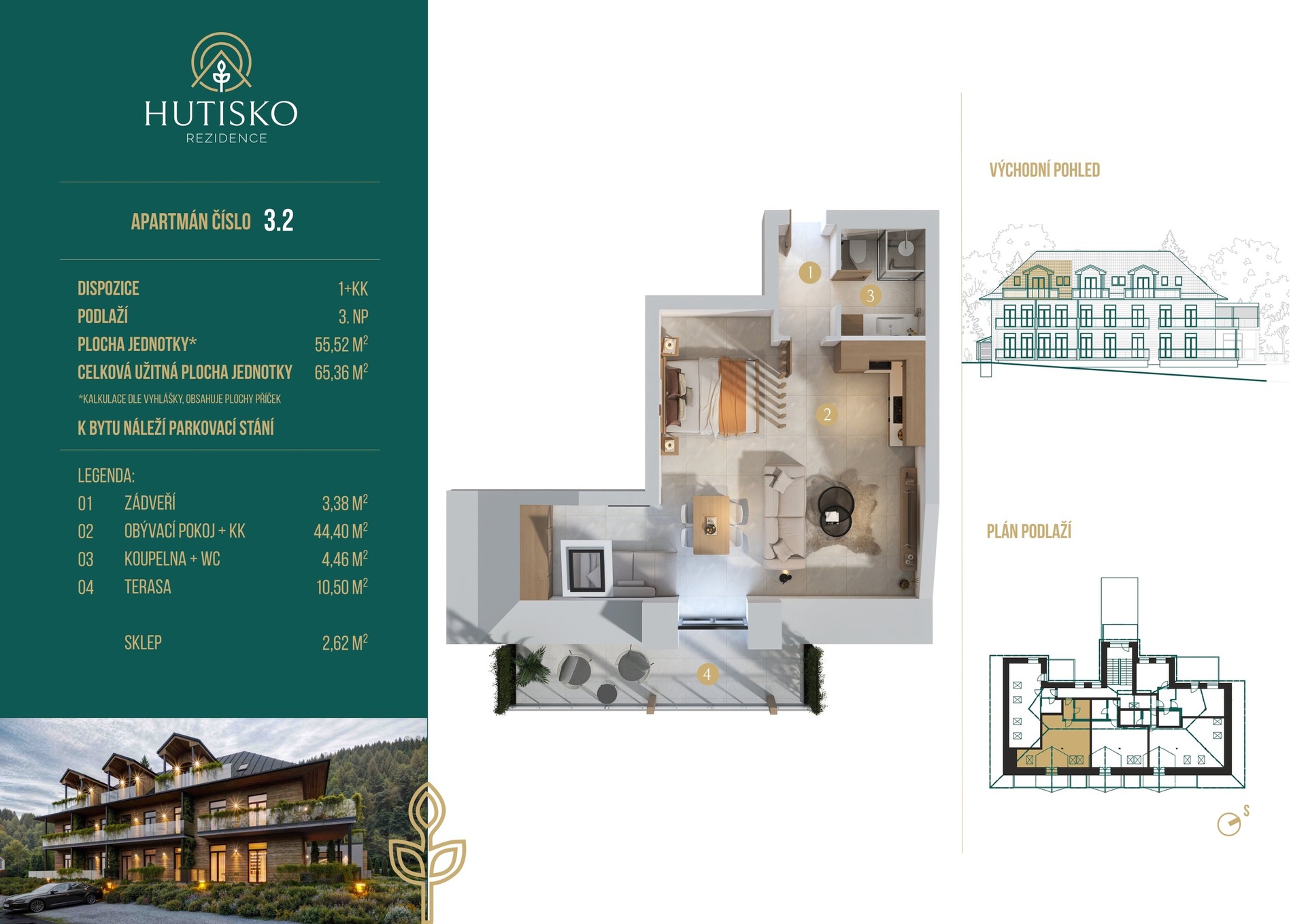 V nejvyšším, 3. nadzemním podlaží Rezidence Hutisko, se nachází tento prostorný a dokonale prosvětlený byt 1+kk (55,5 m2), který vás okouzlí svou atmosférou i promyšleným uspořádáním. Velkorysý otevřený interiér je přirozeně rozdělen na obytnou část a klidovou zónu pro ložnici, takže prostor působí vzdušně, ale zároveň útulně. Smart Home Living by Loxone Každý byt v Rezidenci Hutisko je vybaven chytrým systémem Loxone Smart Home Living. Ten umožňuje automatizaci světel, topení, žaluzií i řízení vstupu. Díky němu si můžete přizpůsobit své bydlení přesně podle svého rytmu a potřeb, včetně možnosti pohodlného ovládání hudby. Rezidence je navržena s ohledem na moderní technologie i udržitelný provoz. Komfort, který přesahuje běžné bydlení Každý byt v Rezidenci Hutisko je plně vybavený do posledního detailu - od nábytku a kuchyňského zařízení až po textilie a dekorace. Celý interiér tvoří harmonický celek s důrazem na přírodní materiály a valašský charakter projektu. Střešní okna zaplavují interiér denním světlem a umožní vám pozorovat oblohu přímo z postele. Večerní světlo se mění v jemné teplo, které se odráží od dřevěných povrchů a vytváří klidnou, domáckou atmosféru. Dominantou bytu je prostorná terasa (10,5 m2), na kterou vstoupíte přímo z obývací části - ideální místo pro ranní kávu nebo večerní sklenku vína s výhledem na beskydské hřebeny. Služby a zázemí Projekt nabízí jedinečné horské bydlení se zajištěnou správou. Byty budou zkolaudovány k trvalému bydlení, čímž vzniká výjimečná příležitost vlastnit nemovitost v horách, která splňuje veškeré standardy pro celoroční užívání i trvalé bydliště. Parkovací místo a sklep jsou zahrnuty v ceně. Rezidence Hutisko Projekt Rezidence Hutisko představuje moderní způsob pojetí horské bydlení v souladu s budoucím přímo sousedícím wellness v nově budovaných Máchových lázních, vše v srdci Beskyd, v obci Hutisko-Solanec. Spojuje valašskou tradici s moderním komfortem, nadstandardním vybavením a službami zaručujícími plnou správu bez jakýchkoli starostí na Vaší straně. Díky své poloze nabízí naprostý klid, čistý vzduch a přímý kontakt s přírodou, ale i pohodlnou dostupnost městských služeb v Rožnově pod Radhoštěm. Klíčové údaje • Dispozice: 1+kk • Podlaží: 3. (poslední) • Terasa: ano, přístupná z obývací části • Výbava: kompletní interiér, nábytek, kuchyň, textilie, dekorace • Služby: správce, údržba rezidence • Parkovací místo a sklep: zahrnuty v ceně Nabídka se týká jedné z 4 posledních jednotek volných v projektu. Kolaudace 2027. Pro další informace kontaktuje makléřku. Budeme se těšit na Váš zájem.