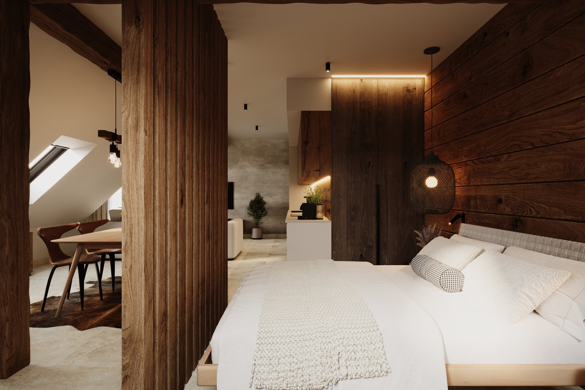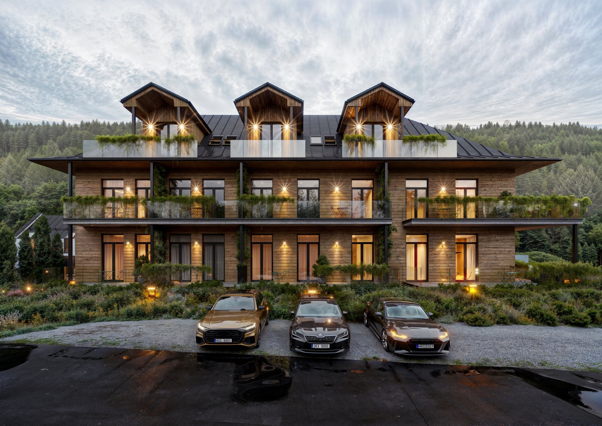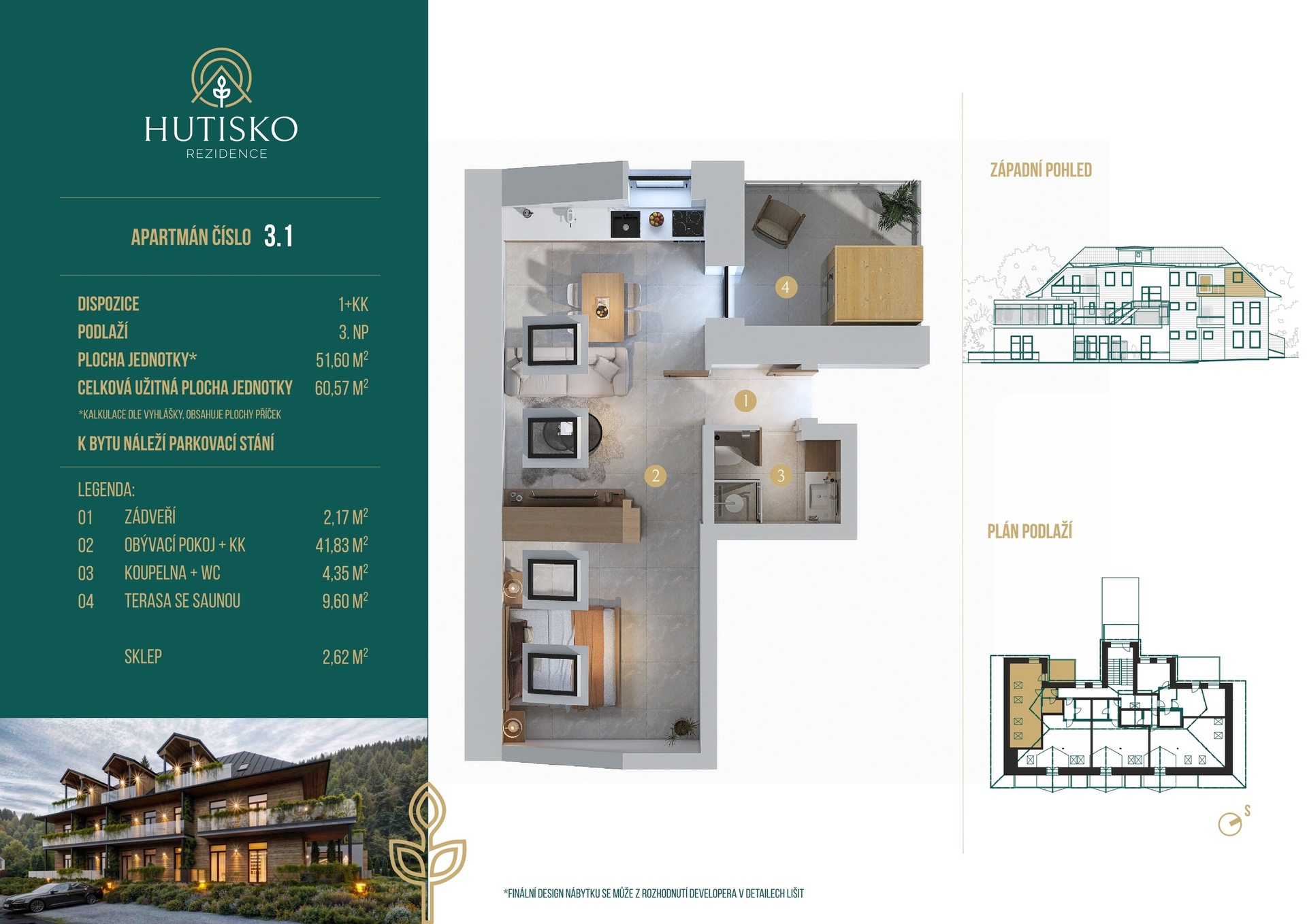 V nejvyšším, 3. nadzemním podlaží Rezidence Hutisko, se nachází tento prostorný a dokonale prosvětlený byt 1+kk (51,6 m2), který vás okouzlí svou atmosférou i promyšleným uspořádáním. Velkorysý otevřený interiér je přirozeně rozdělen na obytnou část a klidovou zónu pro ložnici, takže prostor působí vzdušně, ale zároveň útulně. Smart Home Living by Loxone Každý byt v Rezidenci Hutisko je vybaven chytrým systémem Loxone Smart Home Living. Ten umožňuje automatizaci světel, topení, žaluzií i řízení vstupu. Díky němu si můžete přizpůsobit své bydlení přesně podle svého rytmu a potřeb, včetně možnosti pohodlného ovládání hudby. Rezidence je navržena s ohledem na moderní technologie i udržitelný provoz. Komfort, který přesahuje běžné bydlení Každý byt v Rezidenci Hutisko je plně vybavený do posledního detailu - od nábytku a kuchyňského zařízení až po textilie a dekorace. Celý interiér tvoří harmonický celek s důrazem na přírodní materiály a valašský charakter projektu. Střešní okna zaplavují interiér denním světlem a umožní vám pozorovat oblohu přímo z postele. Večerní světlo se mění v jemné teplo, které se odráží od dřevěných povrchů a vytváří klidnou, domáckou atmosféru. Dominantou bytu je prostorná terasa (9,62 m2) se SAUNOU, na kterou vstoupíte přímo z obývací části - ideální místo pro ranní kávu nebo večerní sklenku vína s výhledem na beskydské hřebeny. Služby a zázemí Projekt nabízí jedinečné horské bydlení se zajištěnou správou. Byty budou zkolaudovány k trvalému bydlení, čímž vzniká výjimečná příležitost vlastnit nemovitost v horách, která splňuje veškeré standardy pro celoroční užívání i trvalé bydliště. Parkovací místo a sklep jsou zahrnuty v ceně. Rezidence Hutisko Projekt Rezidence Hutisko představuje moderní způsob pojetí horské bydlení v souladu s budoucím přímo sousedícím wellness v nově budovaných Máchových lázních, vše v srdci Beskyd, v obci Hutisko-Solanec. Spojuje valašskou tradici s moderním komfortem, nadstandardním vybavením a službami zaručujícími plnou správu bez jakýchkoli starostí na Vaší straně. Díky své poloze nabízí naprostý klid, čistý vzduch a přímý kontakt s přírodou, ale i pohodlnou dostupnost městských služeb v Rožnově pod Radhoštěm. Klíčové údaje • Dispozice: 1+kk • Podlaží: 3. (poslední) • Terasa: ano, přístupná z obývací části • Výbava: kompletní interiér, nábytek, kuchyň, textilie, dekorace • Služby: správce, údržba rezidence • Parkovací místo a sklep: zahrnuty v ceně Nabídka se týká jedné z 4 posledních jednotek volných v projektu. Kolaudace 2027. Pro další informace kontaktuje makléřku. Budeme se těšit na Váš zájem.