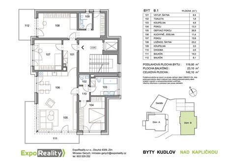 Příjemné bydlení nedělá jen byt sám o sobě, roli hraje také lokalita a prostředí kolem nás. Projekt "Byty nad Kapličkou" ve dvou novostavbách nabízí podmanivou atmosféru domova s důrazem na soukromí a klid v malebném prostředí Kudlova ve Zlíně. Tato lokalita splní vaše představy o dokonalém bydlení. Stavební povolení je vydáno, dokončení projektu se očekává v říjnu 2027. Projekt zahrnuje šest nových bytových jednotek s dispozicemi 4+KK. Byty jsou koncipované tak, aby oslovily jak mladé lidi hledající vlastní bydlení, tak současné obyvatele této vyhledávané lokality. Vše je navrženo tak, aby bylo bydlení nejen příjemné a praktické, ale i komfortní a moderní. Velká okna zajistí dostatek světla, a každý byt bude prosluněný a vzdušný. Samozřejmostí je nadstandardní terasa u každého bytu. Ke každému bytu je možnost dokoupit samostatnou zděnou garáž a parkovací stání. Konkrétně byt B1 v 1. nadzemním podlaží o dispozici 4+KK a podlahové ploše 119 m2 se dvěma balkony 22,1 m2 a sklepem 5 m2 poskytuje k užívání plochu celkem 147 m2. Pohodlí budoucích obyvatel zvyšuje osobní výtah z garáží v suterénu do všech podlaží. Možnost rozdělení na dva samostatné byty (1+kk a 3+kk). Skvělá příležitost pro vícegenerační bydlení nebo samostatný atelier. Hlavní přednosti projektu: * Exkluzivita: pouze jeden byt na patře a moderní výtah. * Variabilita: možnost rozdělení na dva byty (1+kk a 3+kk). * Technologie: V ceně bytu klimatizace, venkovní žaluzie, plynový kotel, podlahové vytápění = nízké náklady na bydlení. * Parkování: garáž a parkovací stání. * Lokalita: příroda na dosah, MHD a školka „za rohem“, centrum města do 7 min. Každý detail v tomto bytě byl pečlivě promyšlen a vybírán s důrazem na kvalitu. Moderní hliníková okna s praktickými předokenními žaluziemi garantují pohodlí a soukromí. O příjemnou teplotu v horkých i chladných dnech se postará efektivní kombinace vlastního plynového kotle a tepelného čerpadla. Nádherně sladěné vinylové podlahy a luxusní dlažba tvoří nadčasový estetický dojem. Koupelna a WC jsou vybavené kvalitními zařizovacími předměty, které splní požadavky i těch nejnáročnějších klientů. Navíc můžete využít možnost klientských změn a upravit detaily uspořádání koupelny a WC podle svých osobních preferencí, čímž si přizpůsobíte prostor přesně svým představám. Vnitřní dveře s impozantní výškou 210 cm dále umocňují pocit velkorysého prostoru. K pohodlí a komfortnímu bydlení přispívají i moderní datové rozvody a klimatizace. Kudlov ve Zlíně se chlubí ideální kombinací klidného rezidenčního bydlení s výhodami městského života. V bezprostřední blízkosti, pouhých 100 metrů, naleznete obchod s čerstvými potravinami a školku. Bezproblémovou dostupnost centra Zlína, které je vzdáleno jen 7 minut jízdy, zabezpečuje zastávka MHD vzdálená 150 metrů. Navíc, lokalita nabízí blízkost nádherné přírody a lesů, které jsou ideální pro milovníky procházek, běhu nebo cyklistiky, a poskytují tak úžasnou příležitost pro relaxaci a aktivní odpočinek.